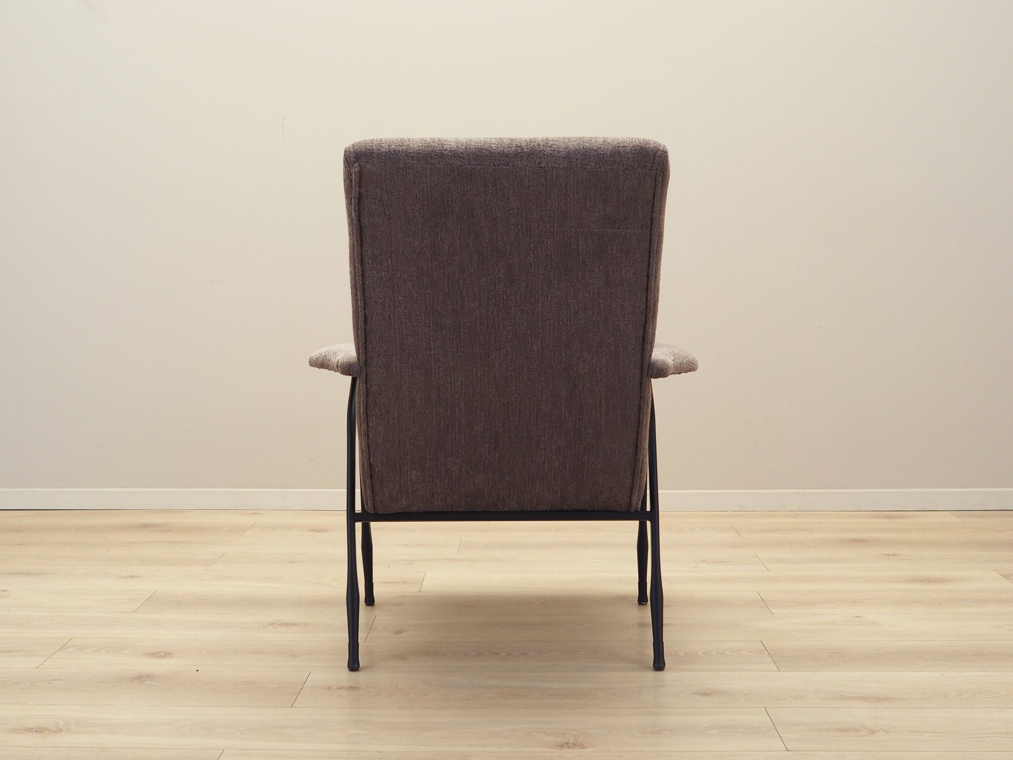Authentic 1970s Italian armchair with a sleek modernist design. Features durable metal legs and has been professionally reupholstered in high-quality grey fabric, offering a clean and contemporary update. The structure remains in good vintage condition with minor marks and scratches consistent with age. Comfortable, stylish, and versatile—perfect for living rooms, reading corners, or modern interiors. Fully restored and ready for use.