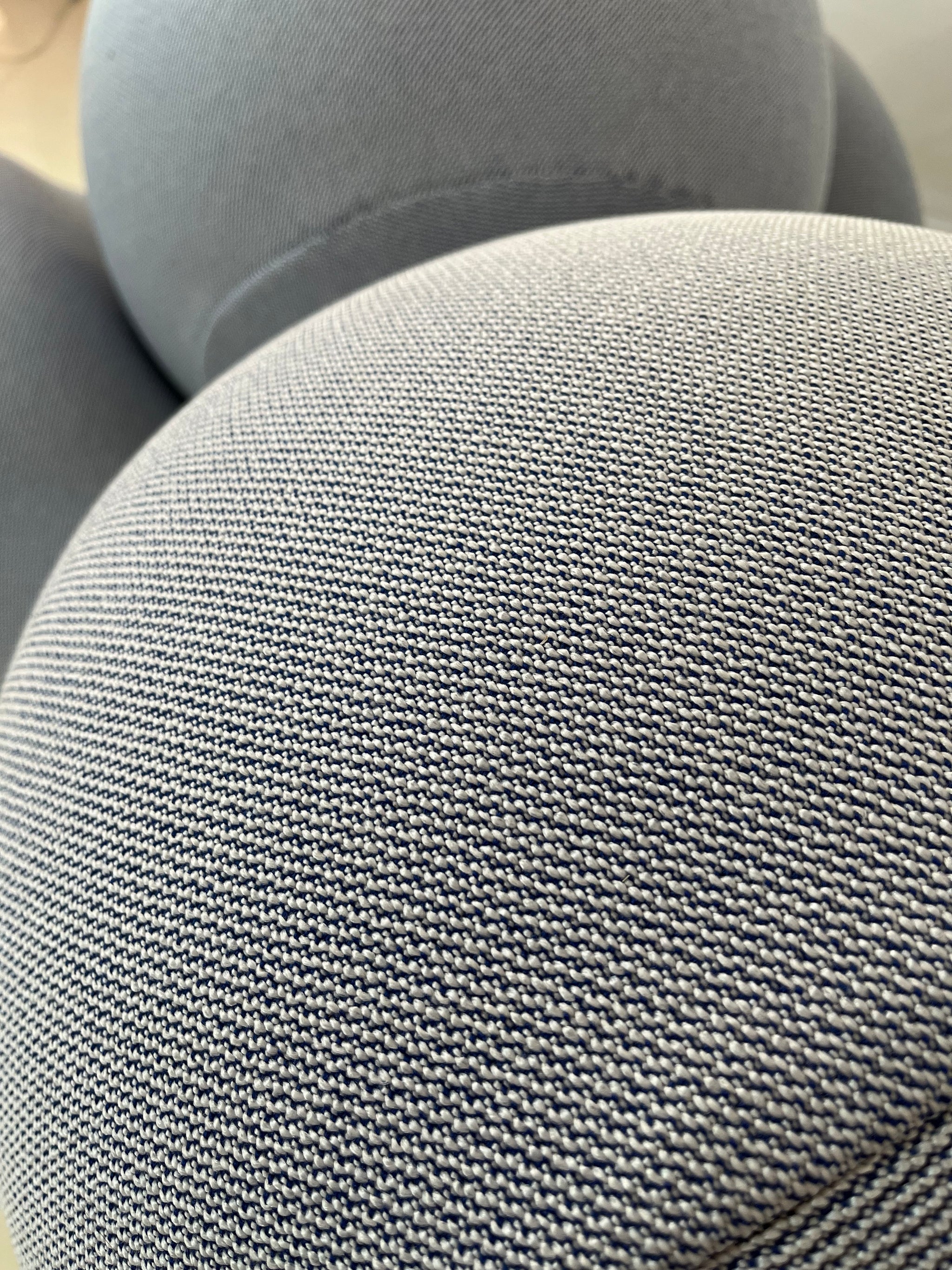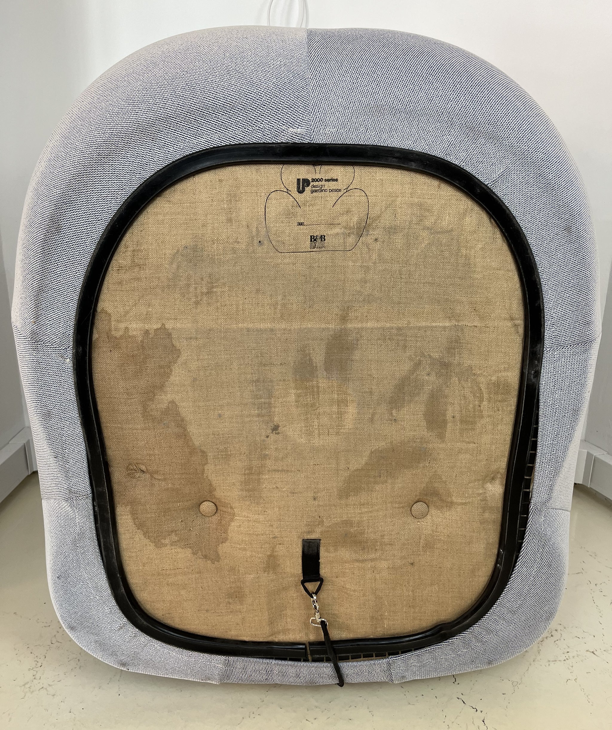 The iconic Big Mama Chair and ottoman by Gaetano Pesce, an emblematic design from the late 1960s that fuses bold form with social commentary. The bulbous chair, paired with its spherical ottoman, resembles the silhouette of a woman, Pesce’s metaphor for the oppression and prejudice faced by women, a design meant to provoke dialogue. This reupholstered edition is in excellent condition, with fresh fabric enhancing its sculptural presence. The ottoman (ball) measures 40 cm in diameter. A rare and powerful piece of postmodern Italian design history.
