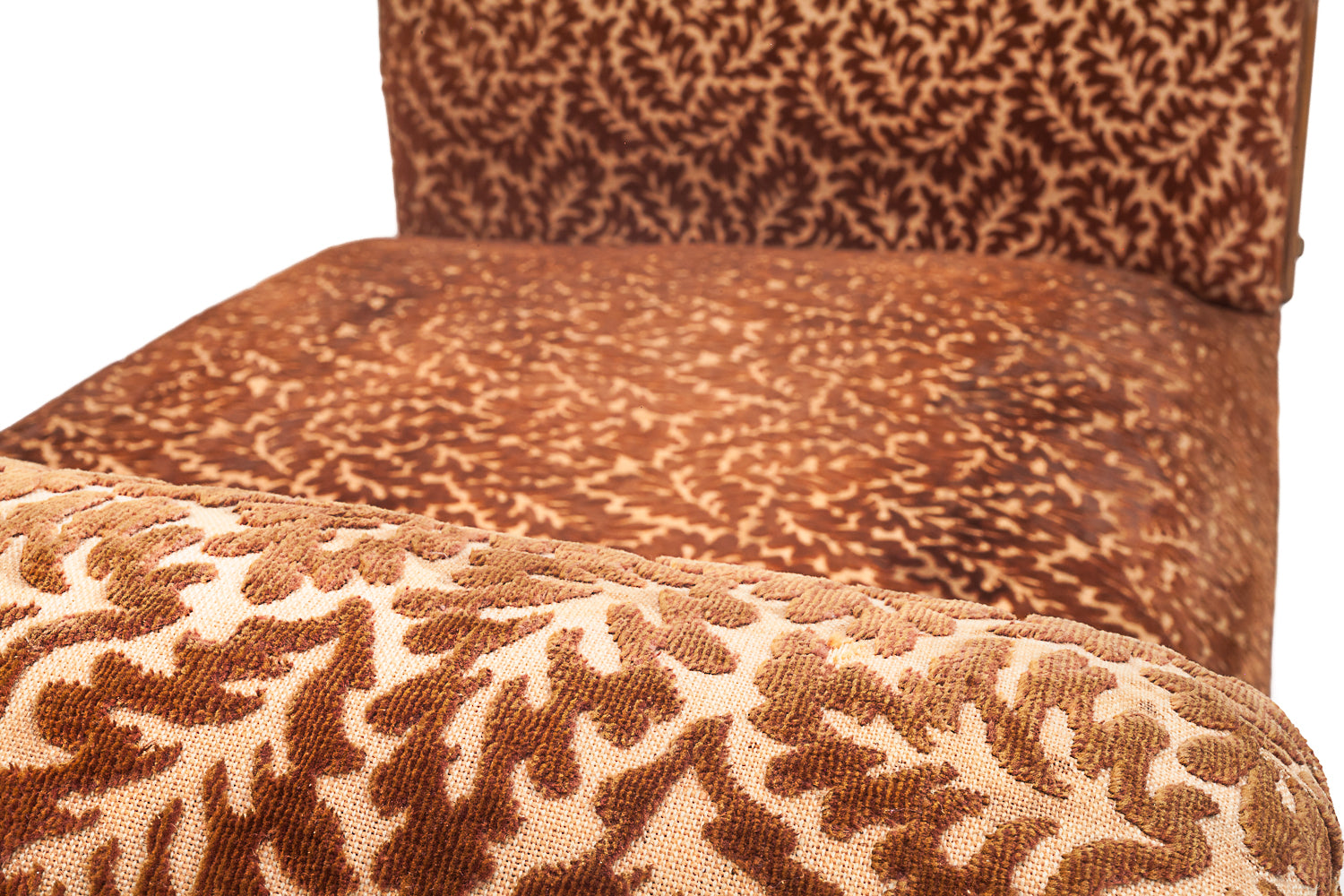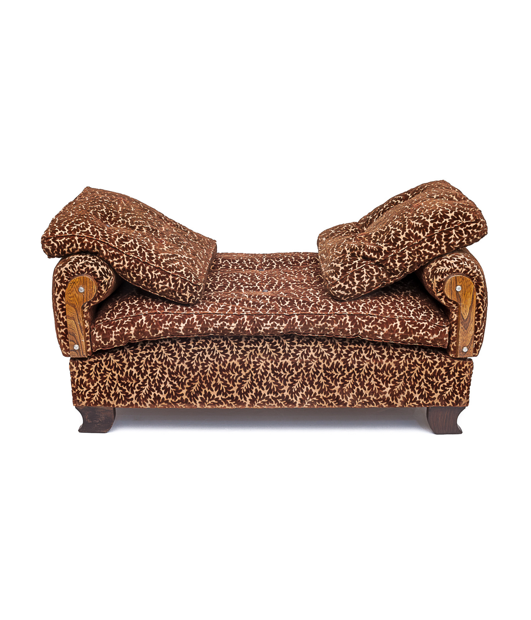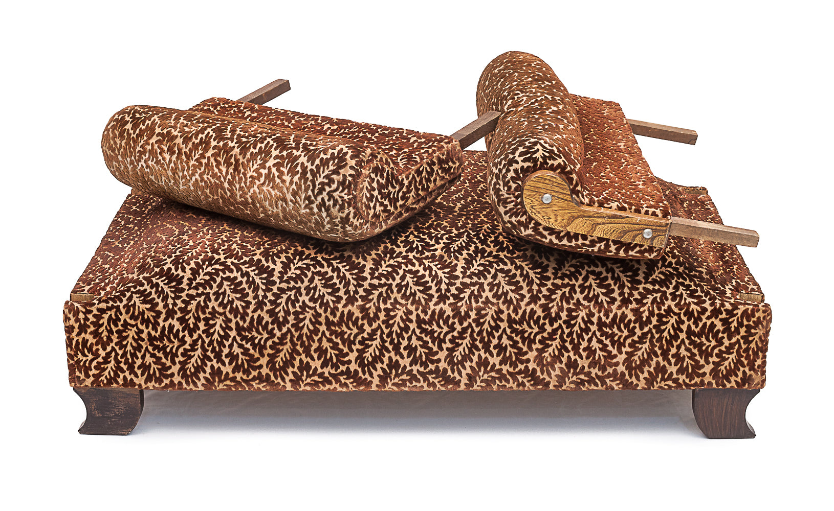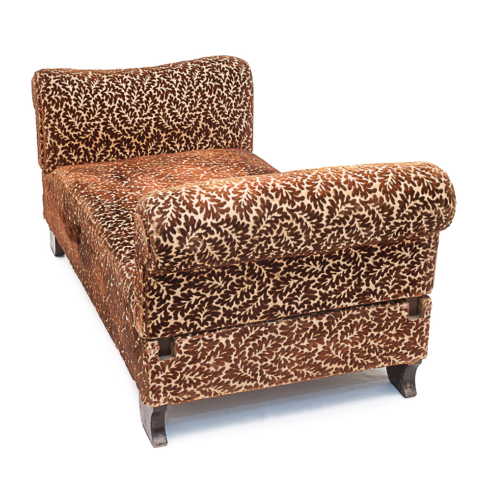 This elegant Art Deco daybed from circa 1900 features its original carved silk velvet upholstery with an oak leaf motif. It includes one large seat cushion and two matching accent cushions. The armrests are removable and adjustable to three positions, allowing for flexible use as a daybed or lounge. The seat is firm and flawless, supported by four identical oak legs. Upholstery is very clean and odorless. A rare and refined piece, ideal for both period and contemporary interiors.