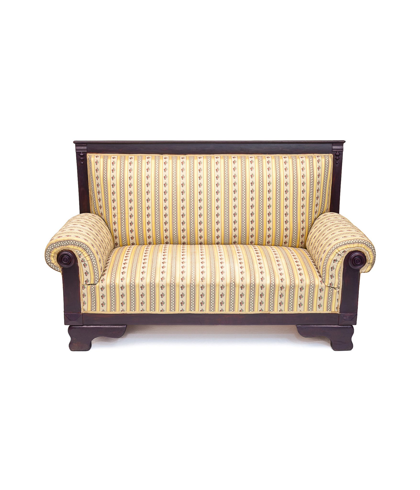 This elegant early 20th-century armchair features its original silk and poplin fabric with a vibrant floral trim. The structure is solid and stable, offering a very comfortable, firm seat and a backrest that snaps in and out with ease. Exceptionally clean and well-preserved, the chair retains its bright colors and flawless upholstery. A charming antique accent for refined interiors. Seat height: 40 cm; Armrest height: 60 cm. A rare piece combining historical character with everyday functionality.