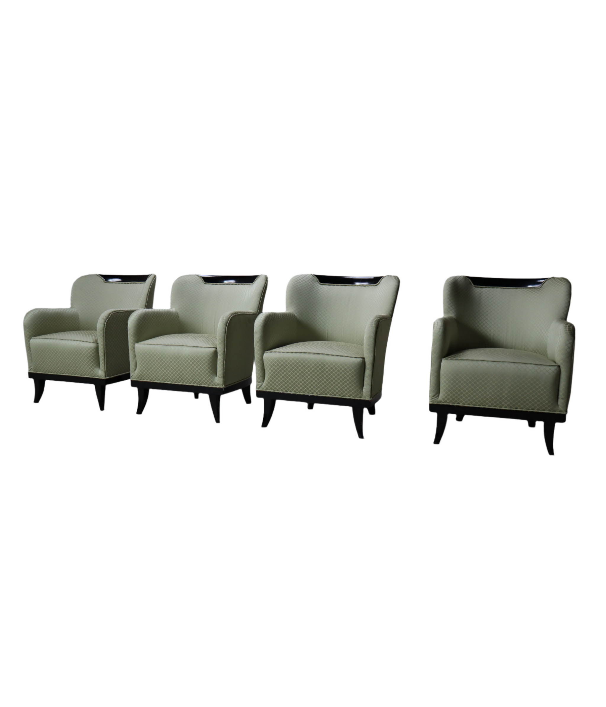 Beautiful set of four Art Deco armchairs, crafted circa 1930s–1950s, featuring elegant lines and timeless design. Solid mahogany frames with stylish black lacquer offer durability and luxury. The plush upholstery with refined stitching ensures a comfortable seating experience, complemented by traditional webbing and artisanal craftsmanship. These armchairs make a stunning addition to any living room, salon, or office, blending seamlessly into both classic and modern interiors. Minor fabric spots noted; seats may have been reupholstered due to their excellent condition.