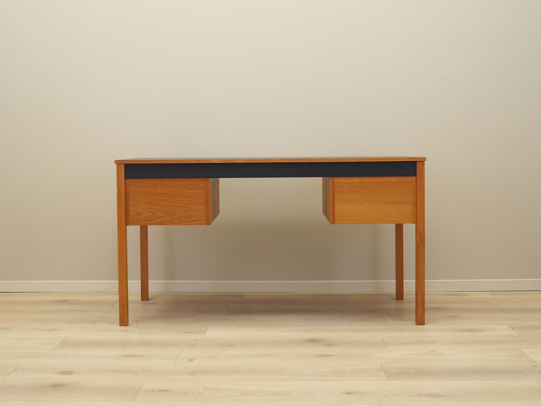 Elegant Danish ash desk, crafted in the 1970s, showcasing the clean lines and balance typical of Scandinavian modern design. The structure and top are finished in ash veneer, with sections partially stained in black for a refined contrast. The solid wood legs are seamlessly integrated into the construction, ensuring both stability and aesthetic harmony. The front features four spacious drawers, offering practical storage. The surface has been refreshed, showing minor filled veneer losses and light marks consistent with age. In very good vintage condition and ready for use. Key not included. For transport, legs, top, and drawers may be removed. Assembly is straightforward, instructional video available on request.