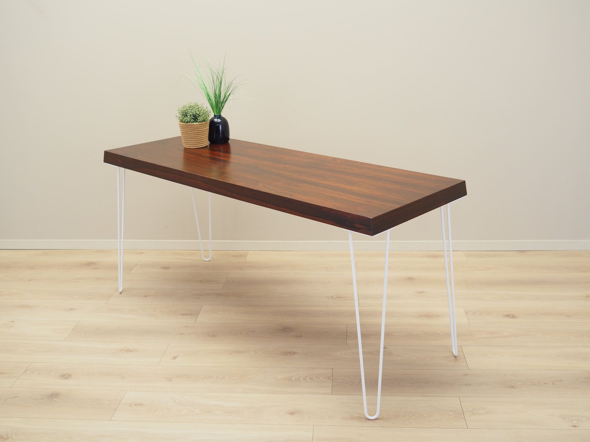 Elegant Danish rosewood desk from the 1970s, showcasing the timeless warmth and refinement of Scandinavian design. The top is finished in rich rosewood veneer, highlighting the natural grain and deep tones of the wood. The desk has been updated with new metal legs, stained white, creating a fresh and modern contrast to the vintage surface. The surface has been refreshed, with minor scratches and light marks consistent with age. In very good vintage condition and ready to use, this piece beautifully combines mid-century craftsmanship with a contemporary twist, making it a perfect fit for both modern and eclectic interiors. For transport, legs and top may be unscrewed. Assembly is simple, instructional video available on request.