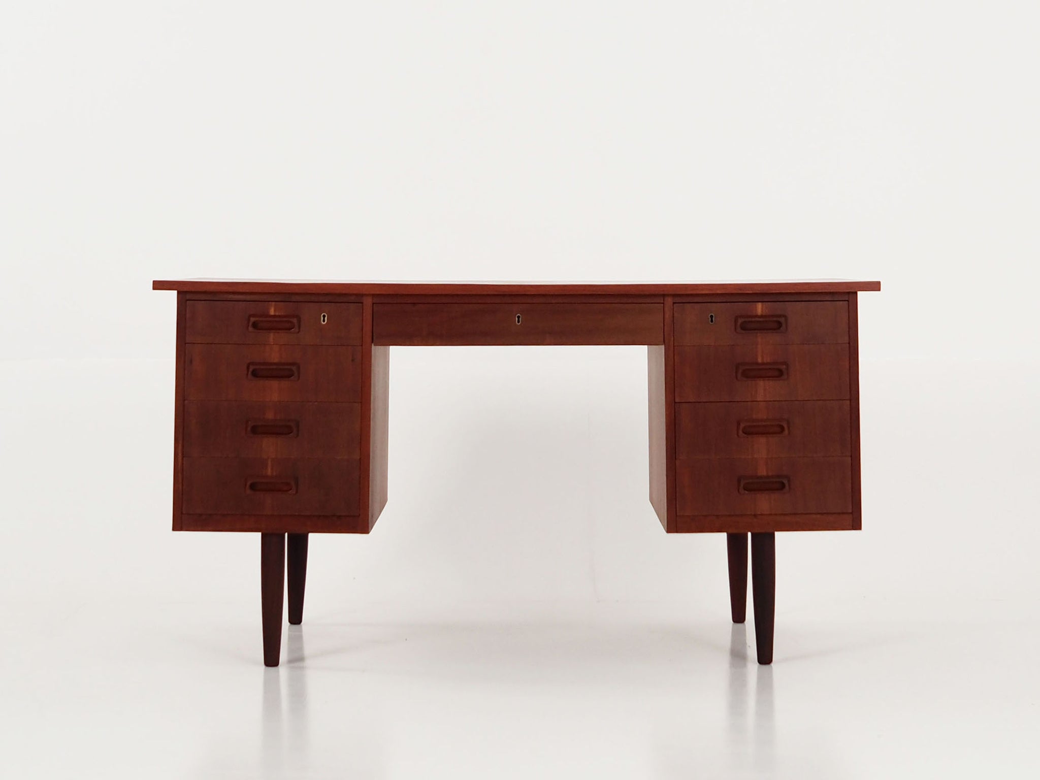 Beautiful Danish teak desk, produced in the 1970s, a fine example of Scandinavian modern design. The structure and top are finished in teak veneer, with solid wood legs seamlessly integrated into the frame for stability and visual harmony. The front features nine spacious drawers, offering generous storage and refined functionality. The desk shows minor scratches, dings, and small veneer losses, consistent with age, yet remains fully functional and ready for use. Its warm teak tone and balanced proportions make it a timeless addition to any modern or vintage interior. For transport, the legs and top may be removed. Assembly is simple, instructional video available on request.