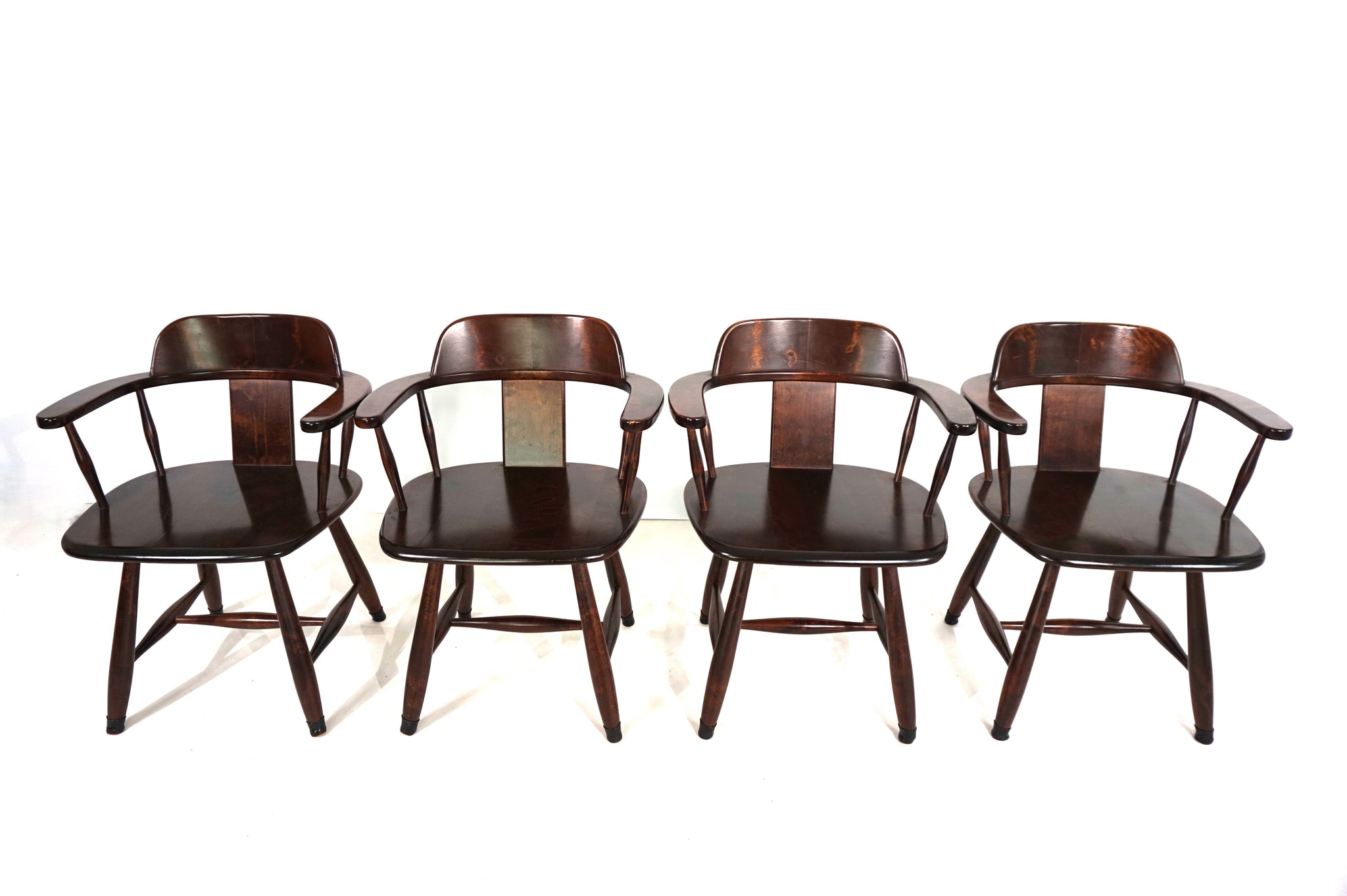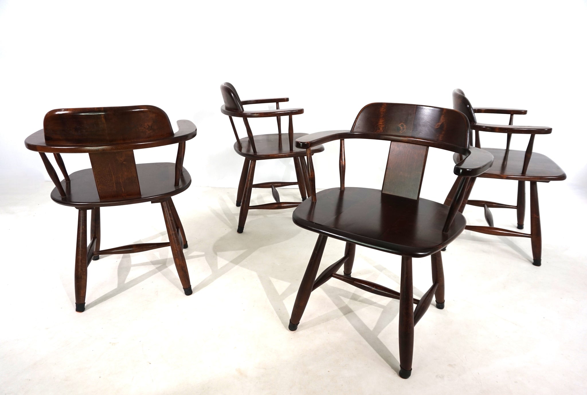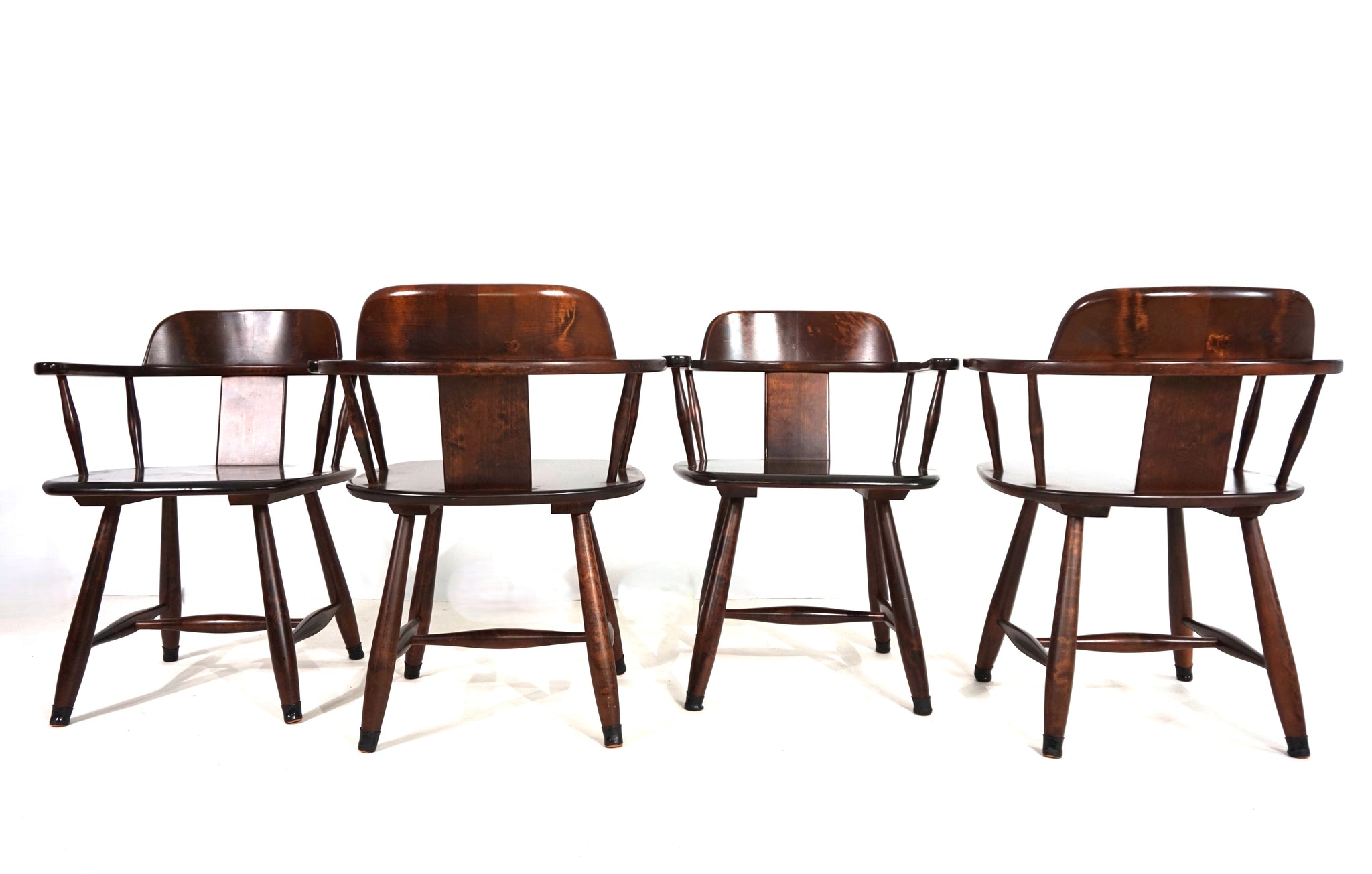 Beautiful set of four Finnish dining chairs crafted in dark-patinated birchwood, showcasing the natural grain and warm tonal variations that define early Finnish craftsmanship. The curved backs and solid construction combine comfort with understated elegance, while the original parquet leg protectors remain intact and can be easily removed if desired. These chairs embody the authentic origins of Finnish furniture design — robust, refined, and timeless. Produced by Asko, the renowned Finnish manufacturer founded in 1919, celebrated for its collaborations with leading designers such as Ilmari Lappalainen and its commitment to innovation and quality throughout the mid-20th century. In very good vintage condition, with minimal signs of age and use.