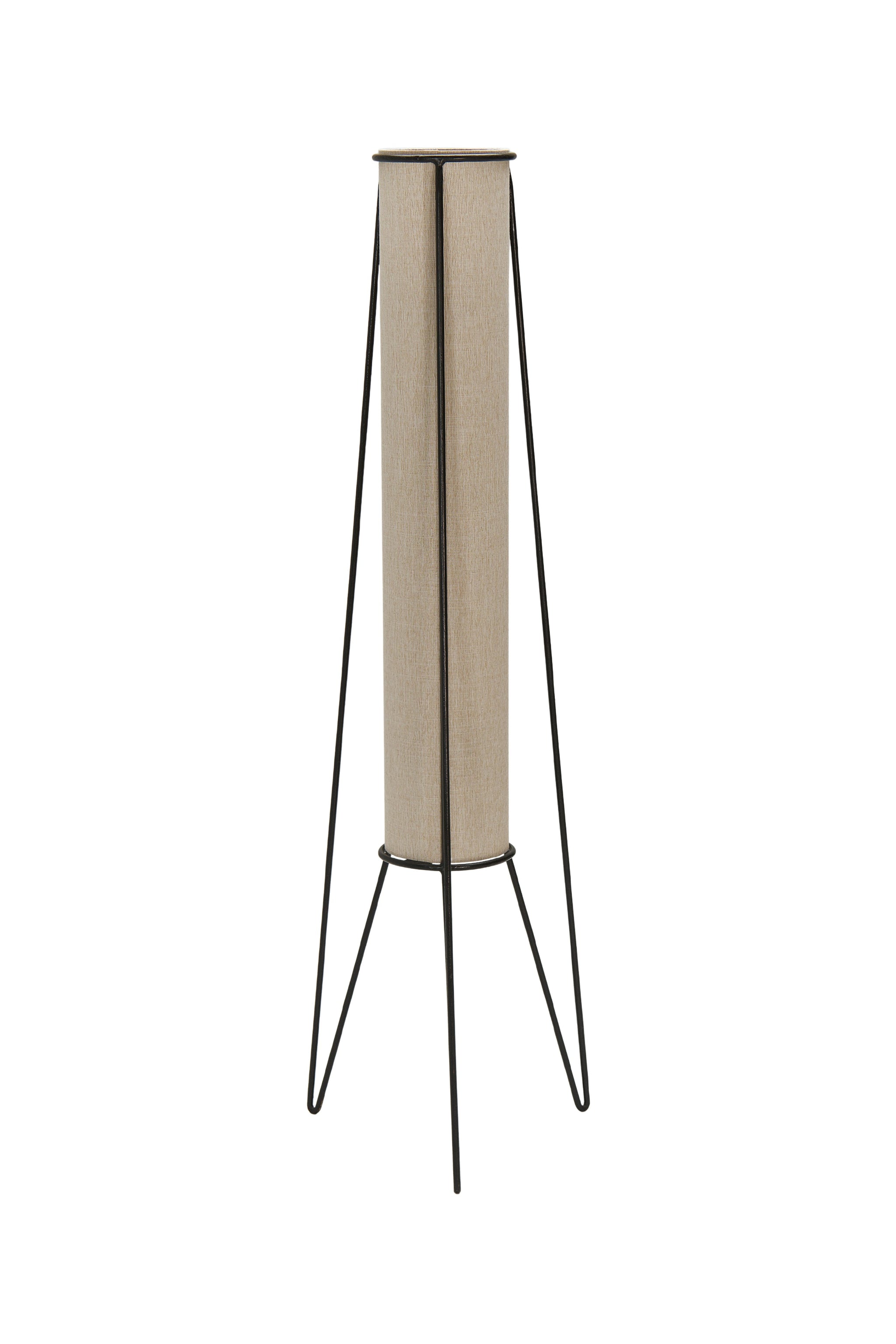 Charming tripod floor lamp, presumably handcrafted in a private workshop in the 1950s. The lamp features a black-lacquered wire-frame base with triangular supports that rise gracefully to meet the shade, creating a striking architectural silhouette. Equipped with two light sources, one above and one below, it produces a soft, diffused glow that enhances the surrounding space with warmth and depth. A fine example of mid-century craftsmanship, combining simplicity, function, and sculptural presence. In very good vintage condition, fully operational and visually captivating. A perfect addition to any modernist or design-driven interior.