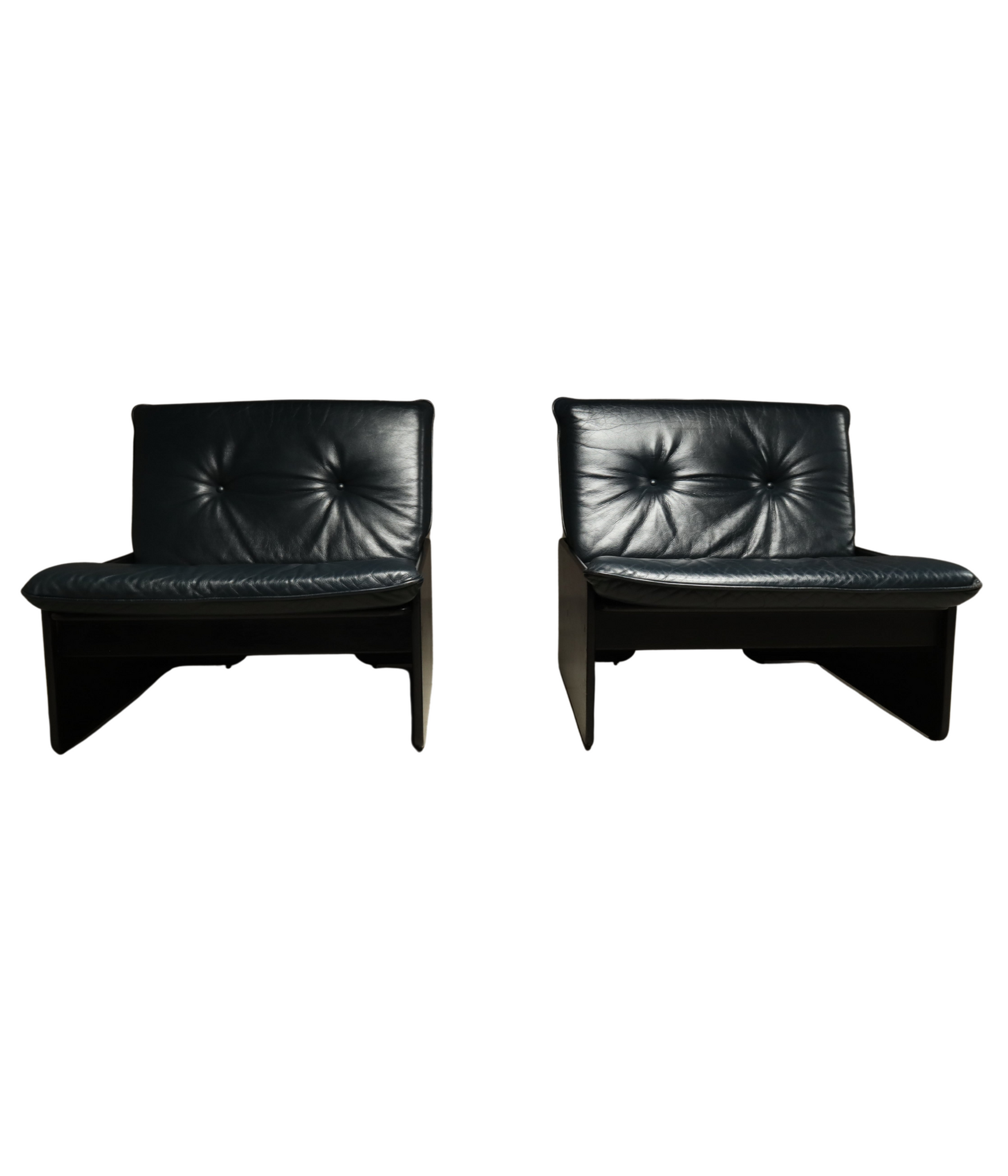 A rare set of lounge chairs from the “Jeans Rondo” collection by Erik Deforce (Ric Def) for Hi-Plan, Belgium, 1972. Awarded a Design Centre Brussels selection in the same year, this pair is a documented example of Belgian modern design, still bearing the original sticker. Each chair features a sculptural frame in black lacquered oak plywood with rounded edges, paired with generous dark blue leather cushions. Conceived as part of a Pop-Art influenced total interior concept, the collection was produced in denim, lacquer, and leather versions, this pair representing one of the most collectible. Deforce, also known for his iconic Lord chair, infused the series with playful geometry and modernist craftsmanship. In very good condition with a corrected past restoration, both chairs present beautifully while retaining authenticity. Dimensions: 92 × 72 × 74 cm; seat height 35 cm. A highly collectible piece of 1970s Belgian design heritage.
