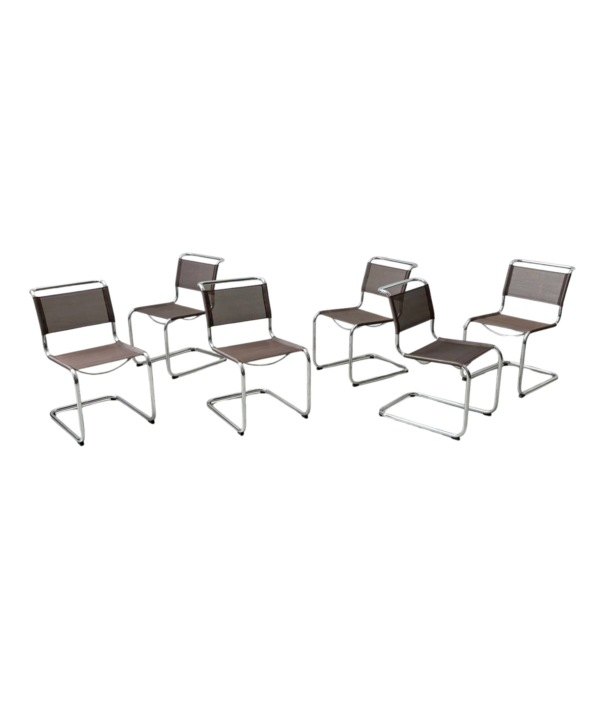 Set of six original Thonet S33 cantilever chairs, designed by Dutch architect Mart Stam—an icon of Bauhaus modernism and a milestone in 20th-century design. Reduced to pure function, the chairs feature the revolutionary tubular steel frame that eliminates back legs, creating the characteristic cantilevered swing. Frames are chrome-plated with a curved sled base, paired with dark brown plastic mesh seats and backs that offer both stability and the famous “sitting on air” comfort. Each chair carries Thonet branding and technical embossing confirming authenticity. Condition is very good: chrome surfaces remain bright, mesh upholstery intact, and only light age-consistent wear is visible.