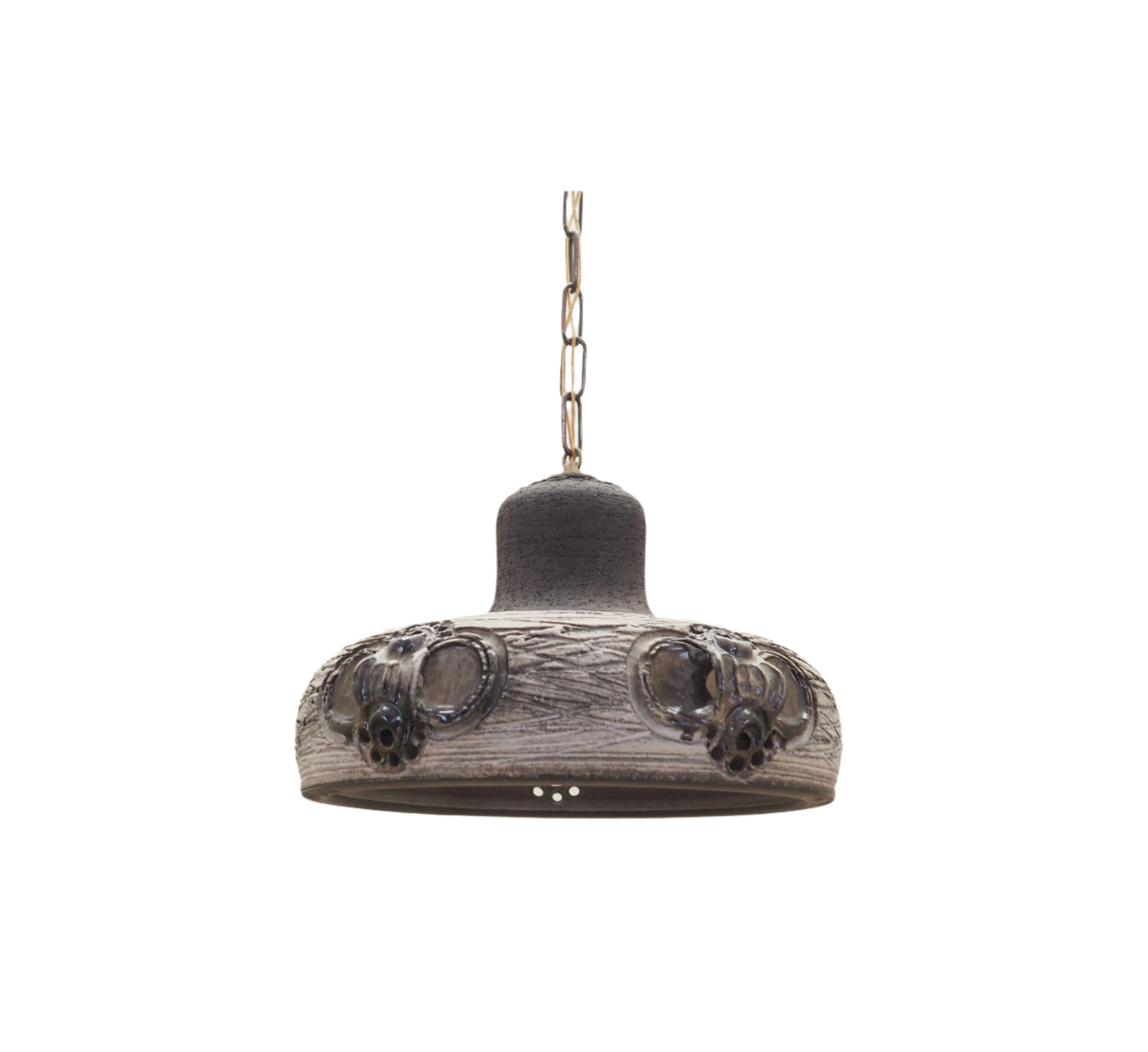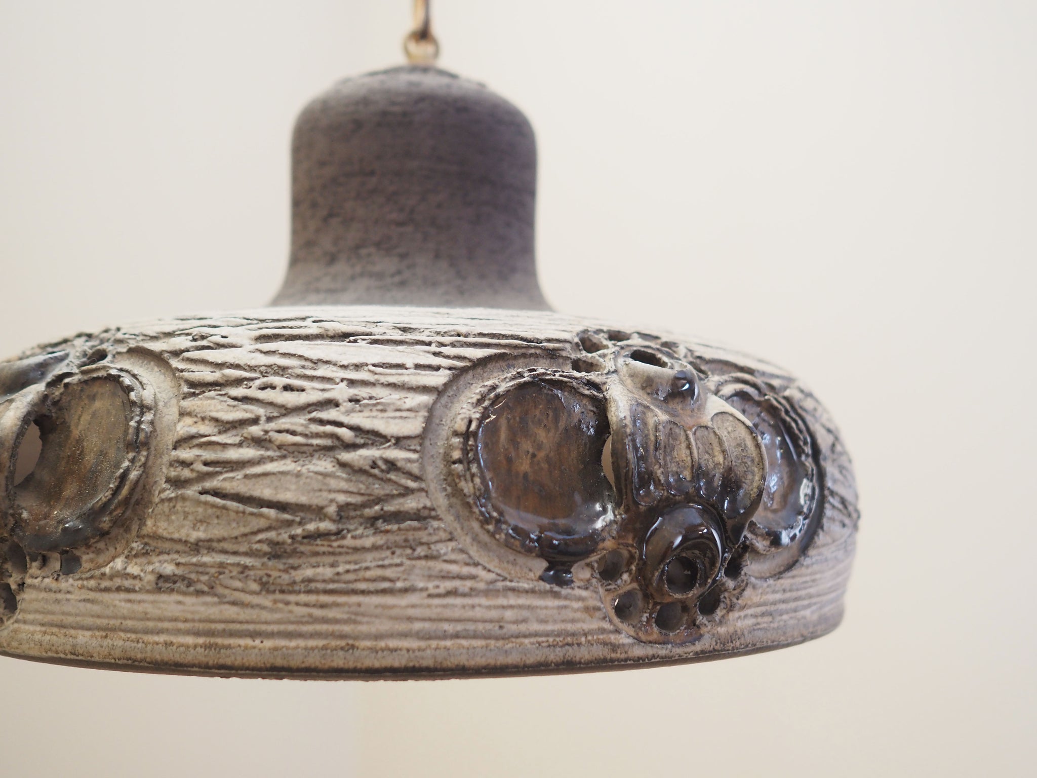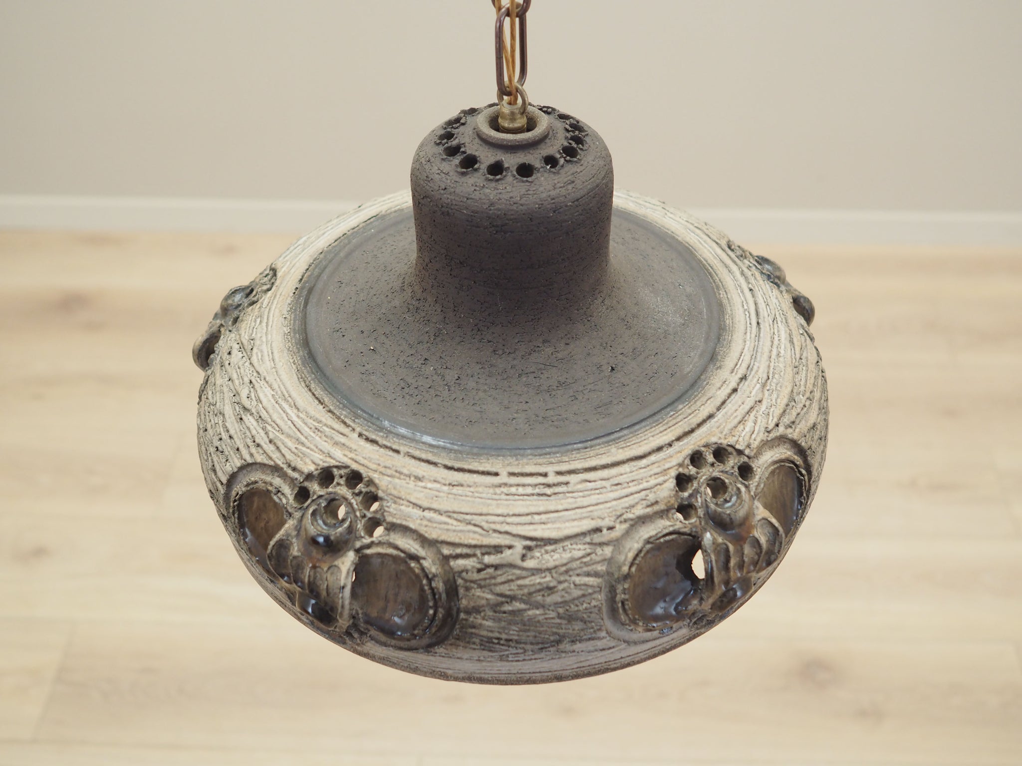 This 1960s Danish lamp features a ceramic construction in grey. The design not only serves as an aesthetic element but also diffuses light to create a pleasant interior atmosphere.