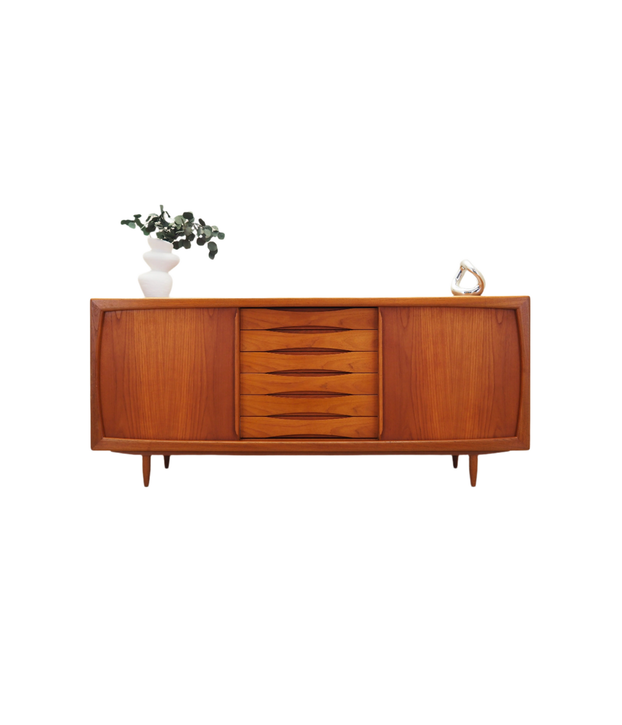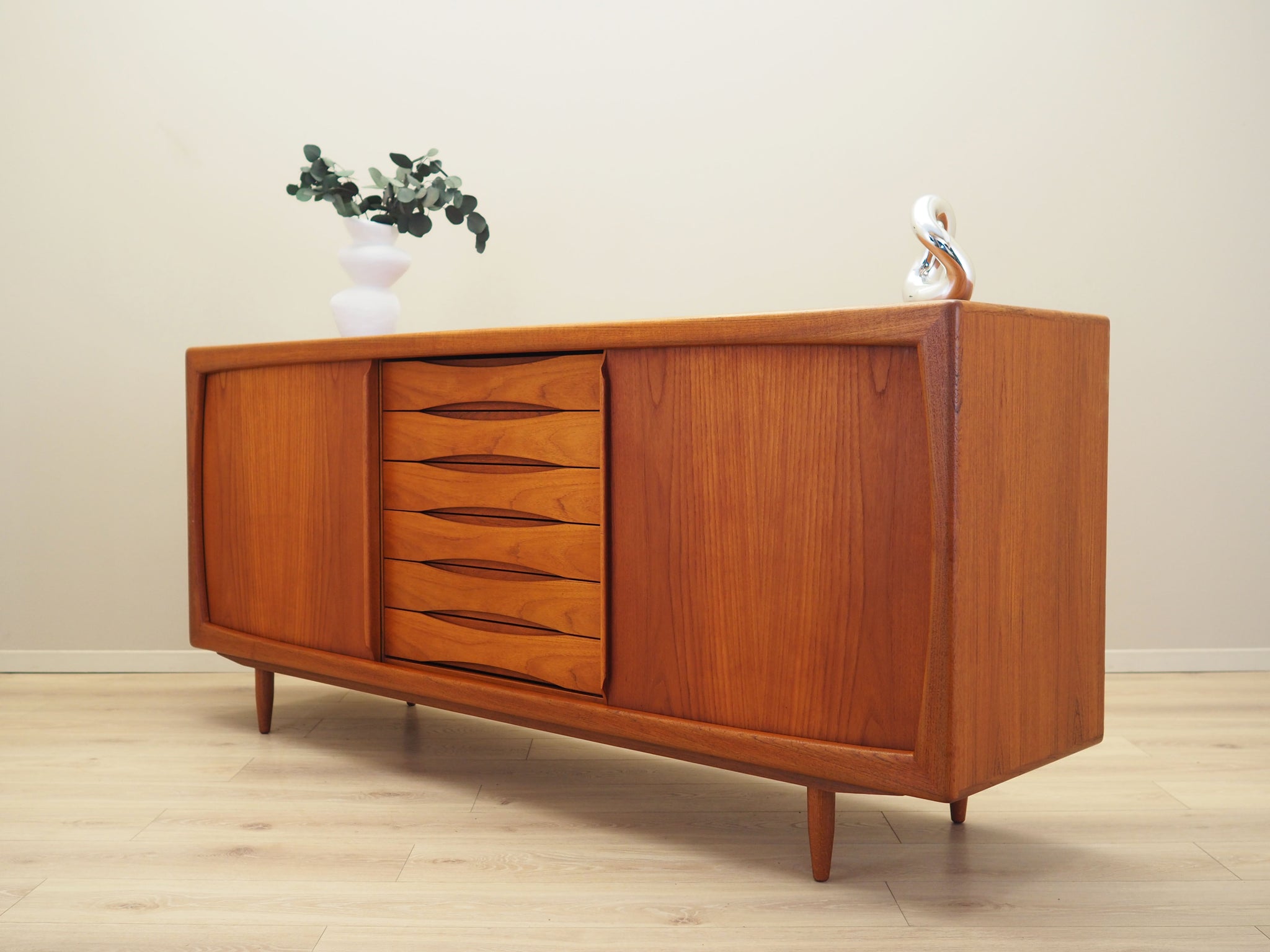 Crafted in the 1970s by esteemed Danish maker Dyrlund, this vintage teak sideboard blends timeless design with everyday functionality. The structure features rich teak veneer with solid wood legs and has been professionally refreshed. It offers generous storage via six spacious drawers and four adjustable shelves. Smooth-sliding doors save space while allowing easy access—perfect for storing dinnerware, books, or media equipment. This elegant mid-century modern piece displays minor signs of age, enhancing its authentic charm. A versatile, stylish solution for living or dining spaces, ready for immediate use.
