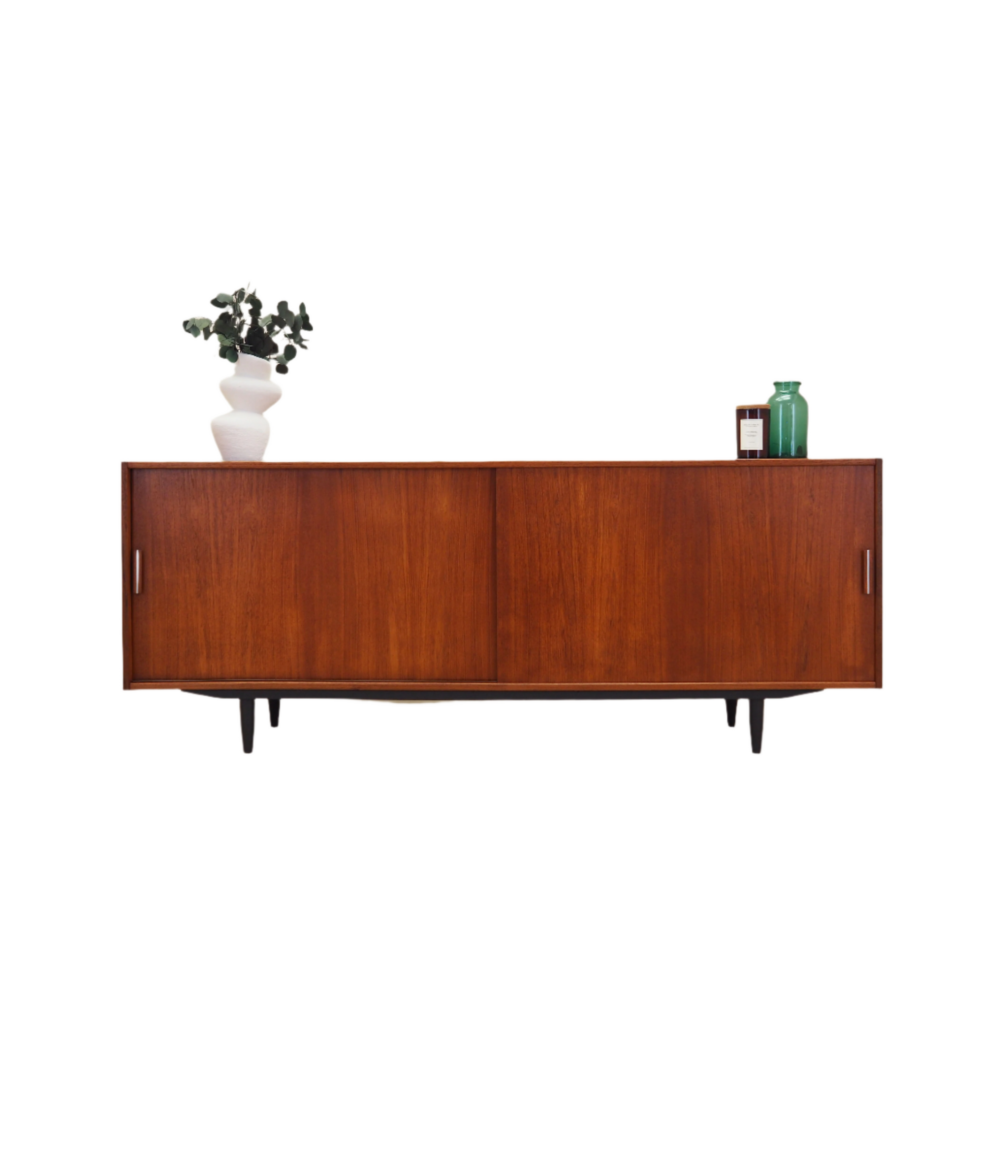 Crafted in Denmark during the 1970s, this teak sideboard features a refined silhouette with a warm teak veneer and solid wood legs stained in black for contrast. Its practical interior includes three spacious drawers and three height-adjustable shelves, offering generous storage without compromising style. The sliding doors allow for easy access while saving space, making it an ideal choice for both compact and open-plan interiors. The piece has been carefully refreshed, showing minor signs of wear consistent with its age, and is ready for immediate use.
